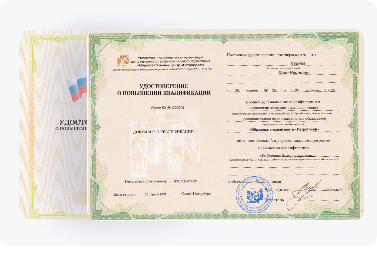 Наш учебный центр обладает лицензией на образовательную деятельность, выданной соответствующим органом Российской Федерации. Это означает, что мы имеем право проводить образовательные мероприятия, в том числе повышение квалификации, и выдавать соответствующие удостоверяющие документы. Наша программа составлена высококвалифицированными педагогами-практиками, прошедшими аттестацию.
